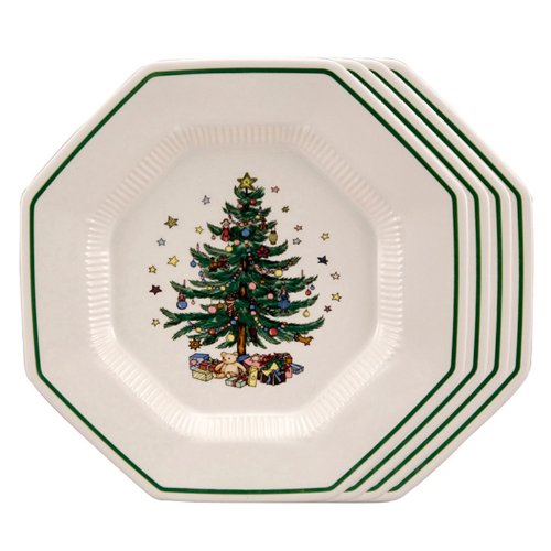 Nikko Ceramic's Christmastime set of four dinner plates add cheer to any occasion during the holiday season. The perfect tableware collection to be used between Thanksgiving and New Year's, this set complements Nikko's Happy Holidays and Christmas Giftware patterns. A joyful tree decked out with decorations and garlands, surrounded by presents, and encircled with colorful stars adorns the recessed serving area of each octagonal 10-3/4-inch plate. Sprigs of holly add a delightful accent to the outer rim, while a delicate band of green trims the edge of each piece. Crafted from fine, creamy white ironstone, each piece insulates heat effectively and is more durable than traditional porcelain. An underglaze keeps colors bright and prevents fading. The plates are safe for use in the oven, microwave, or dishwasher. --Lea Werbel